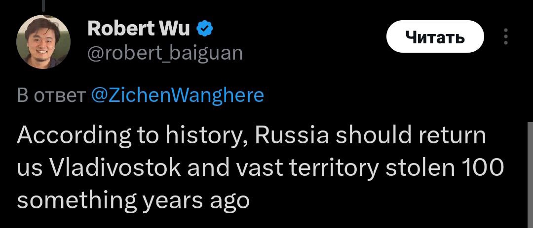 Американский актер китайского происхождения Роберт Ву написал в Х, что по такой логике "Россия должна вернуть нам Владивосток и огромную территорию, украденную 100 с чем-то лет назад".
