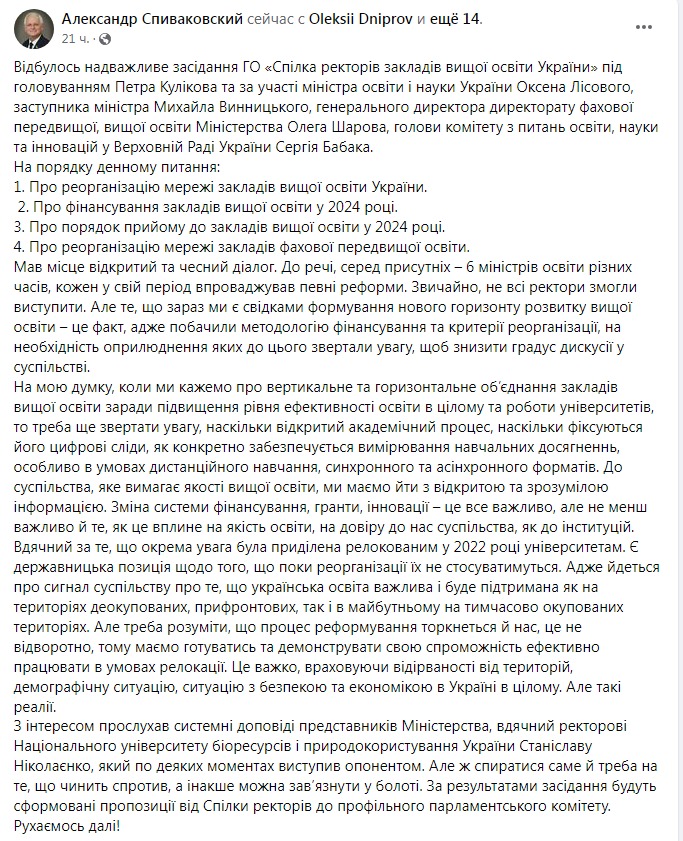 Соответствующую программу обсудили на заседании "Союза ректоров высших учебных заведений Украины" при участии министра образования Оксена Лисового, сообщил в Фейсбуке ректор Херсонского государственного университета Александр Спиваковский.