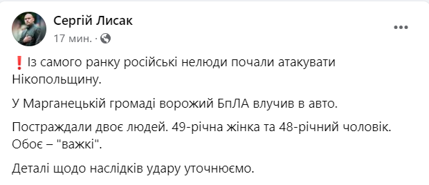 "С самого утра русские изверги начали атаковать Никопольщину. В Марганецкой громаде вражеский БПЛА попал в авто. Пострадали два человека. 49-летняя женщина и 48-летний мужчина. Оба – "тяжелые", - написал он.