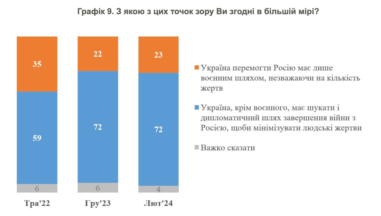 При этом большинство согласно, что помимо военного, нужно искать и дипломатический путь завершения войны. Эта цифра выросла с 59% до 72%.