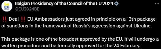 "Послы ЕС только согласовали принципиально 13-й пакет санкций в рамках агрессии России против Украины. Этот пакет является одним из самых широких, утвержденных ЕС. Он пройдет письменную процедуру и будет официально утвержден 24 февраля", – говорится в сообщении.