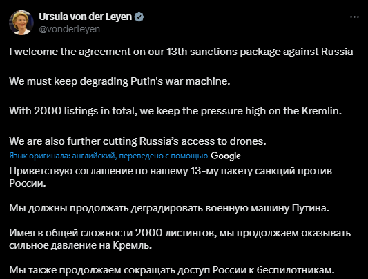 "Я приветствую соглашение о нашем 13-м пакете санкций против России. Мы должны продолжать унижать военную машину Путина. Имея в общей сложности 2000 списков, мы оказываем высокое давление на Кремль. Мы также сокращаем доступ России к беспилотникам", – добавила президент ЕК.