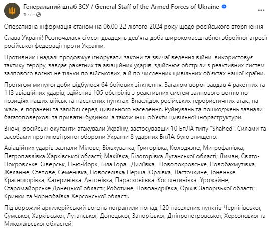 Утром 22 февраля Генштаб ВСУ обнародовал сводку о ситуации на фронте за минувшие сутки.