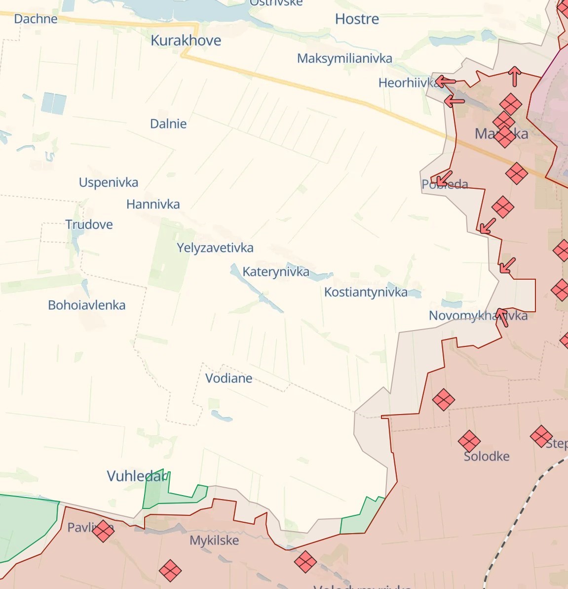 "Задача в этом районе у врага — занять Новомихайловку, Победу, пытаются выйти по всей линии трассы Угледар - Водяное - Константиновка и продолжить движение до административных границ Донецкой области. Продолжаются также попытки движения в сторону Курахово, где противник подобрался к Георгиевке, начал более активные обстрелы Максимилиановки и попытки атак в сторону Красногоровки, чтобы обеспечить прикрытие флангов", - анализирует Deep State.