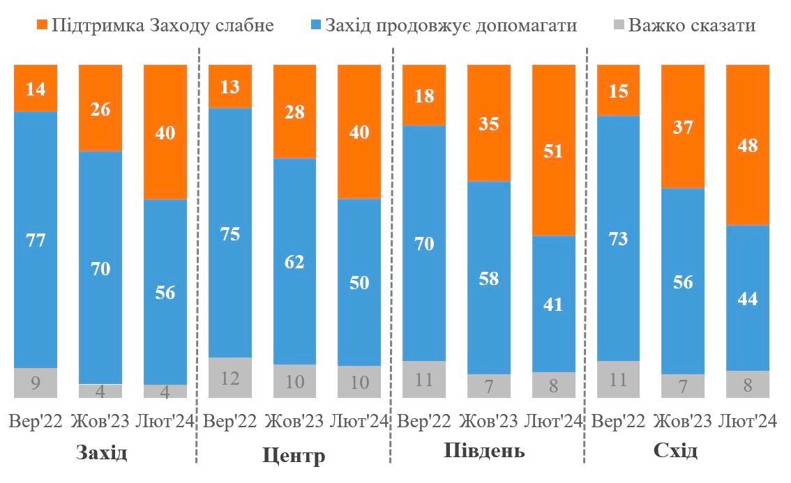 49% считают, что Запад продолжает поддерживать Украину по мере возможностей и хочет завершения войны на выгодных для Киева условиях. Чуть больше года назад было 76%.