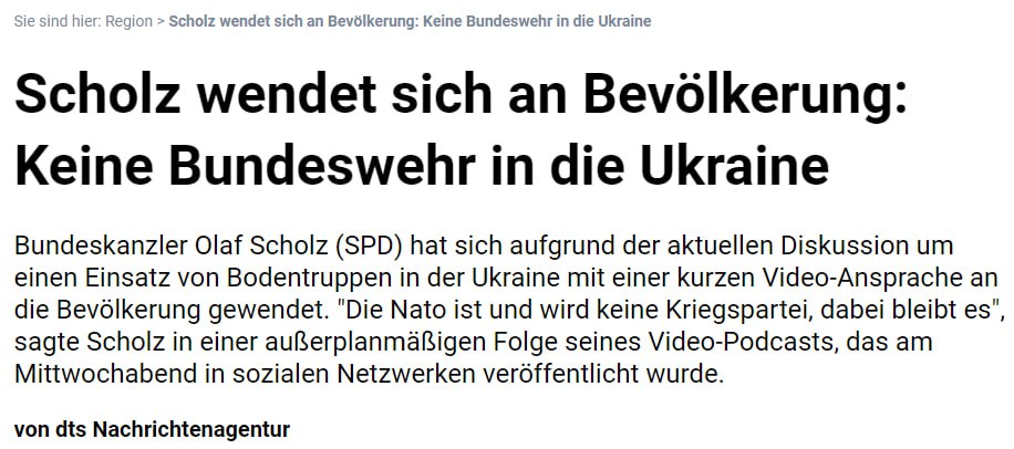 "Чтобы внести ясность: как канцлер Германии я не буду отправлять солдат из нашего Бундесвера в Украину. Солдаты могут на это рассчитывать", – сказал канцлер.