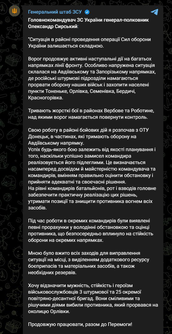 "Особенно напряженная ситуация сложилась на Авдеевском и Запорожском направлениях, где российские штурмовые подразделения пытаются прорвать оборону наших войск и захватить такие населенные пункты, как Тоненькое, Орловка, Семеновка, Бердычи, Красногоровка.