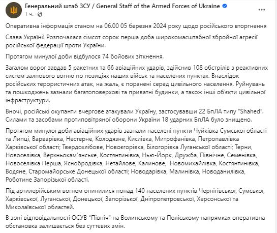 Утром 5 марта Генштаб ВСУ обнародовал сводку о ситуации на фронте.