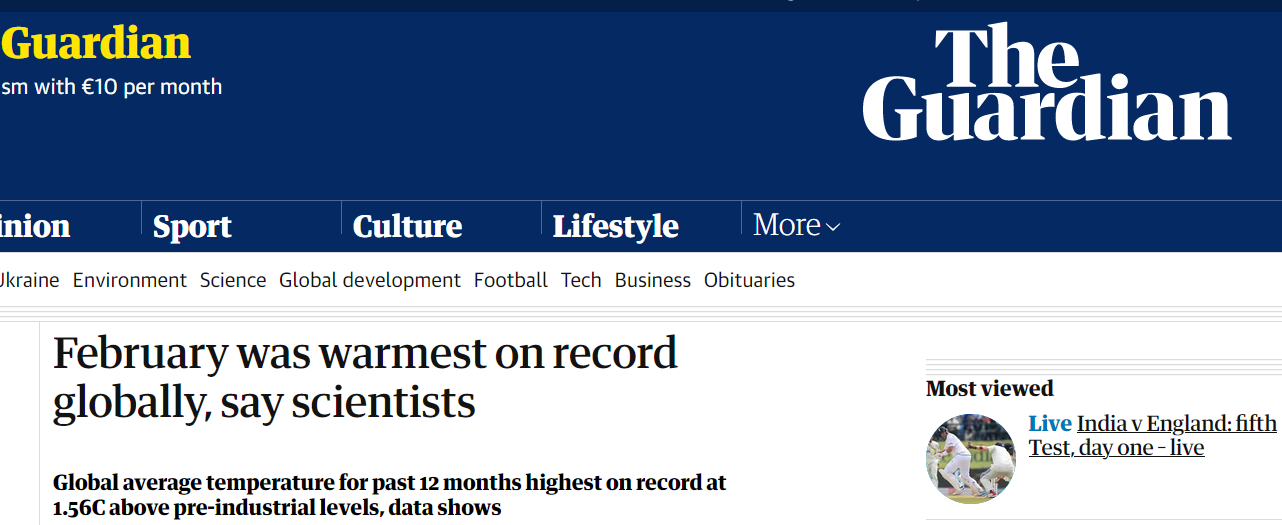 "Средняя глобальная температура за последние 12 месяцев - с марта 2023 года по февраль 2024 года - была самой высокой за всю историю наблюдений: на 1,56 градусов выше доиндустриального уровня", - уточняет издание. Это "временно ставит мир выше порога в 1,5 градусов, по которому в долгосрочной перспективе ожидаются наихудшие последствия изменения климата".