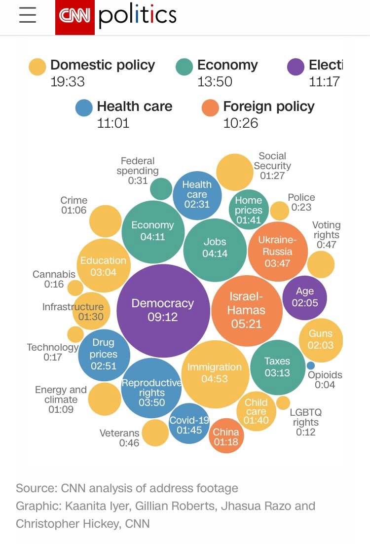 Как подсчитала CNN, куда больше времени он посвятил "демократии" (то есть, видимо, вопросам выборов), войне в секторе Газа, иммиграции, занятости и экономике. Даже вопрос о праве на аборты (reproductive rights) обошел по длительности тему Украины.