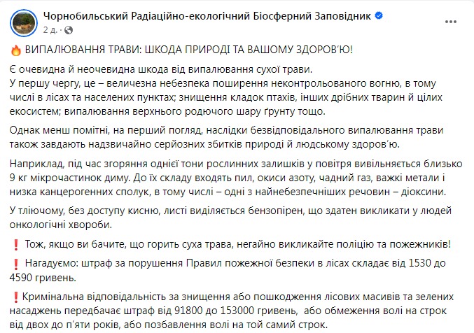 В преддверии сезона пожаров, которые в зоне отчуждения ЧАЭС бывают практически ежегодно, Чернобыльский радиационно-экологический биосферный заповедник рассказал о вреде от выжигания травы. Именно оно часто становится причиной лесных пожаров.