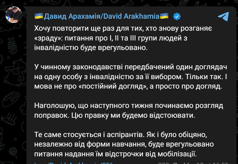 "Видимо, идет речь об отсрочке от мобилизации для лиц, которые ухаживают за инвалидами. В новом законопроекте планировалось ужесточить определение статуса такого лица. Но судя по словам Арахамии, своего попечителя сможет определять сам инвалид", - пишет телеграм-канал.
