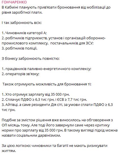 Украинцев, официально зарабатывающих от 35 тыс. гривен, хотят забронировать от мобилизации - нардеп