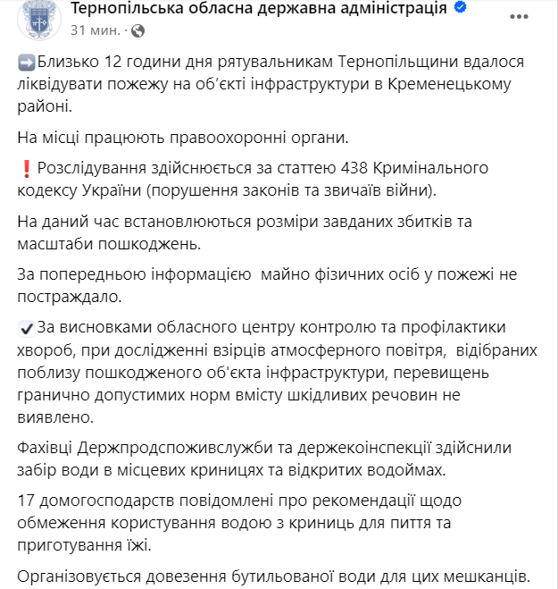 В Тернопольской области могут быть проблемы с водой возле места прилета по объекту инфраструктуры