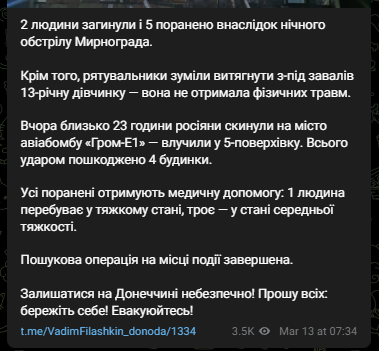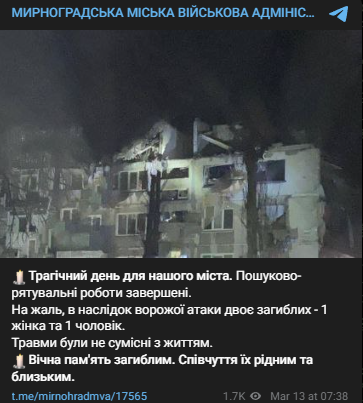 Российские военные, вечером 12 марта, ударили по многоэтажке в Мирнограде Донецкой области. Есть разрушения дома. Два человека погибли, еще пятеро получили ранения. Поисково-спасательные работы завершены.