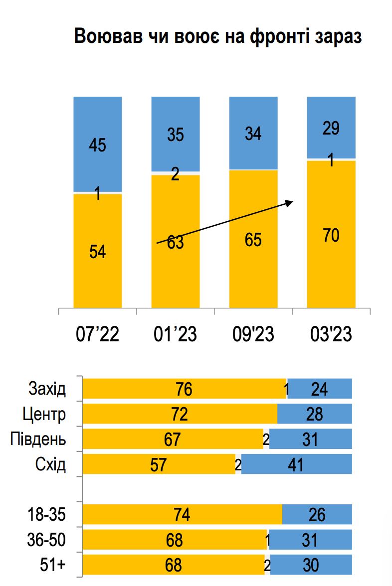 У 70% опрошенных украинцев есть близкие и родные, которые воевали или воюют на фронте после полномасштабного вторжения РФ.