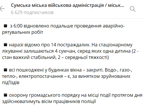 В Сумской городской военной администрации заявили, что спасательные работы на месте попадания российского беспилотника возобновили в 6:00. В настоящее время известно о 14 получивших ранения людях. В больницах города остаются четыре человека, среди которых ребенок.