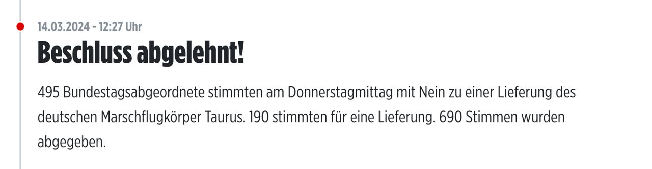 Канцлер Олаф Шольц отказывается посылать Taurus в Украину по тайным причинам, одной из которых могут быть опасения победы России в войне против Украины после чего ракеты могут понадобиться самой Германии. В среду Шольц обвинил оппозиционных законодателей в использовании темы Taurus в качестве инструмента пиара, несмотря на то, что они "знают все" о причинах, одновременно извлекая выгоду из того факта, что эти "знания не являются общедоступными".