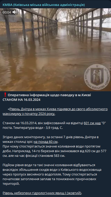 Ранее сообщалось, что в результате увеличения сбросов воды из Киевского водохранилища из-за весеннего половодья на реке Днепр в пределах Киева наблюдается повышение уровня воды, примерно на 6 см в сутки, с начальным затоплением поймы.