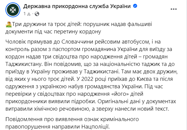 Мужчина заявил пограничникам, что он таджик, имеет на родине двух жен и трех детей и показал их свидетельства о рождении. Якобы в 2022 году он приехал в Киев и после женитьбы на украинке получил гражданство Украины.