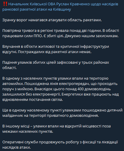 Об этом сообщает начальник Киевской ОВА Руслан Кравченко.