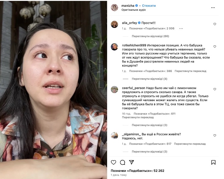 В комментарии под видео пришла Пугачева и написала: "Прости!!!" При этом певица публично не выразила сочувствия ни жертвам теракта, ни владельцам "Крокуса", в котором сама неоднократно выступала. Из-за этого против Пугачевой в РФ поднялась волна возмущения.
