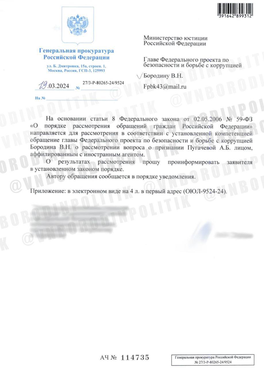 "На основании статьи 8 федерального закона от 02.05.2006 Nº 59-Ф3 "О порядке рассмотрения обращений граждан Российской Федерации" направляется для рассмотрения вопроса о признании Пугачевой А.Б. лицом, аффилированным с иностранным агентом", - сказано запросе.