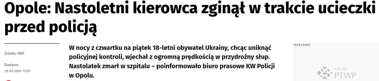 В Польше во время бегства от полиции погиб 18-летний украинец, врезавшись на авто в придорожный столб.