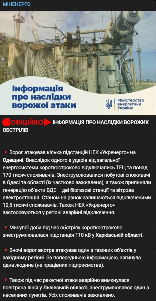Также в Одесской области после ночного удара "Шахедов" от общей энергосистемы краткосрочно отключались ТЭЦ, в результате чего без света оказались 170 тысяч домохозяйств.