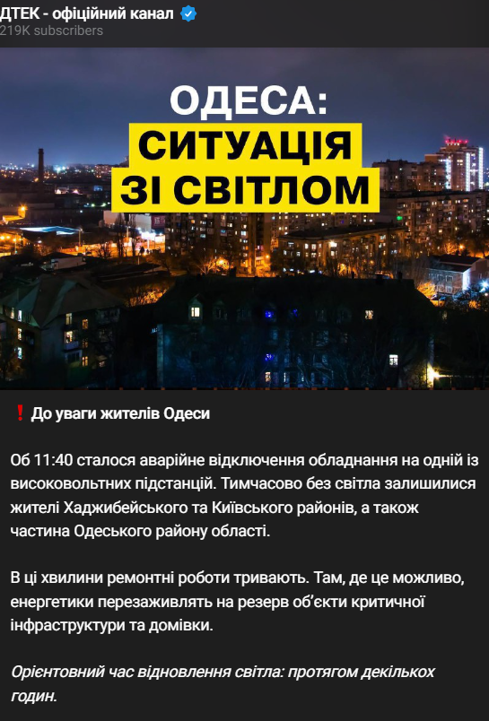 "В 11.40 произошло аварийное отключение оборудования на одной из высоковольтных подстанций. Временно без света остались жители Хаджибейского и Киевского районов, а также часть Одесского района области. В эти минуты ремонтные работы продолжаются. Там, где это возможно, энергетики переключат на резерв объекты критической инфраструктуры и дома. Примерное время восстановления света: в течение нескольких часов", - говорится в сообщении ДТЭК.