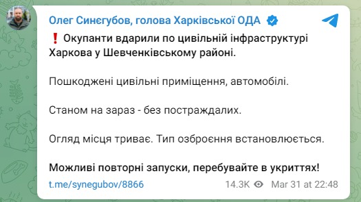 "Повреждены гражданские помещения, автомобили. По состоянию на сейчас – без пострадавших. Осмотр места продолжается. Тип вооружения устанавливается", - отметил Синегубов.