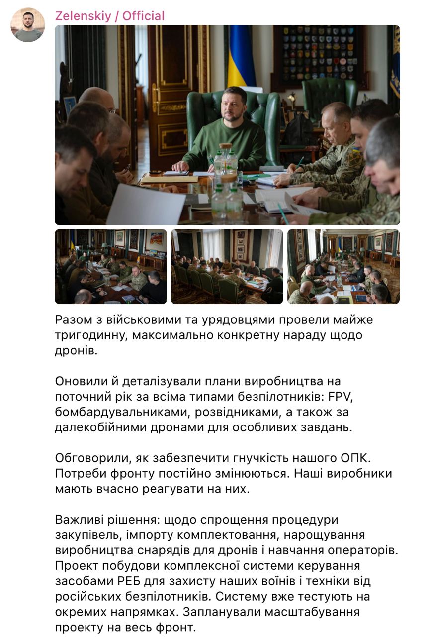 Также были приняты решения по упрощению процедуры закупок, импорта комплектующих, наращивания производства снарядов для дронов и обучения операторов.