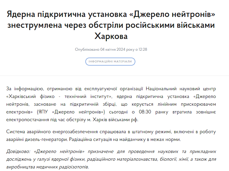 В четверг, 4 апреля, в Харькове из-за российских обстрелов оказалась обесточена ядерная подкритическая установка "Источник нейтронов" в центре "Харьковский физико-технический институт". Система аварийного энергообеспечения сработала в штатном режиме, были включены в работу аварийные дизель-генераторы.