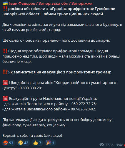 "Россияне обстреляли из "Градов" прифронтовое Гуляйполе Запорожской области и убили трех гражданских людей. Двое мужчин и женщина погибли под завалами собственного дома, в который попал российский снаряд", - говорится в сообщении.