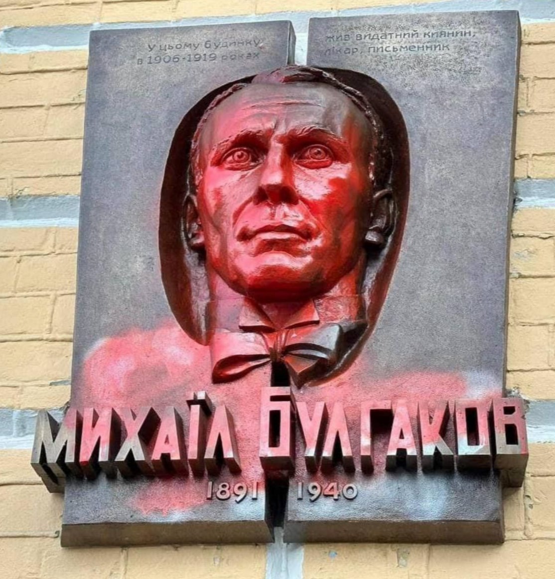 Раньше там была надпись: "В этом доме жил известный русский, советский писатель Михаил Булгаков". В новой версии на украинском языке оказалась другая подпись: "В цьому будинку в 1906 - 1919 роках жив видатний киянин, лікар, письменник Михаїл Булгаков".