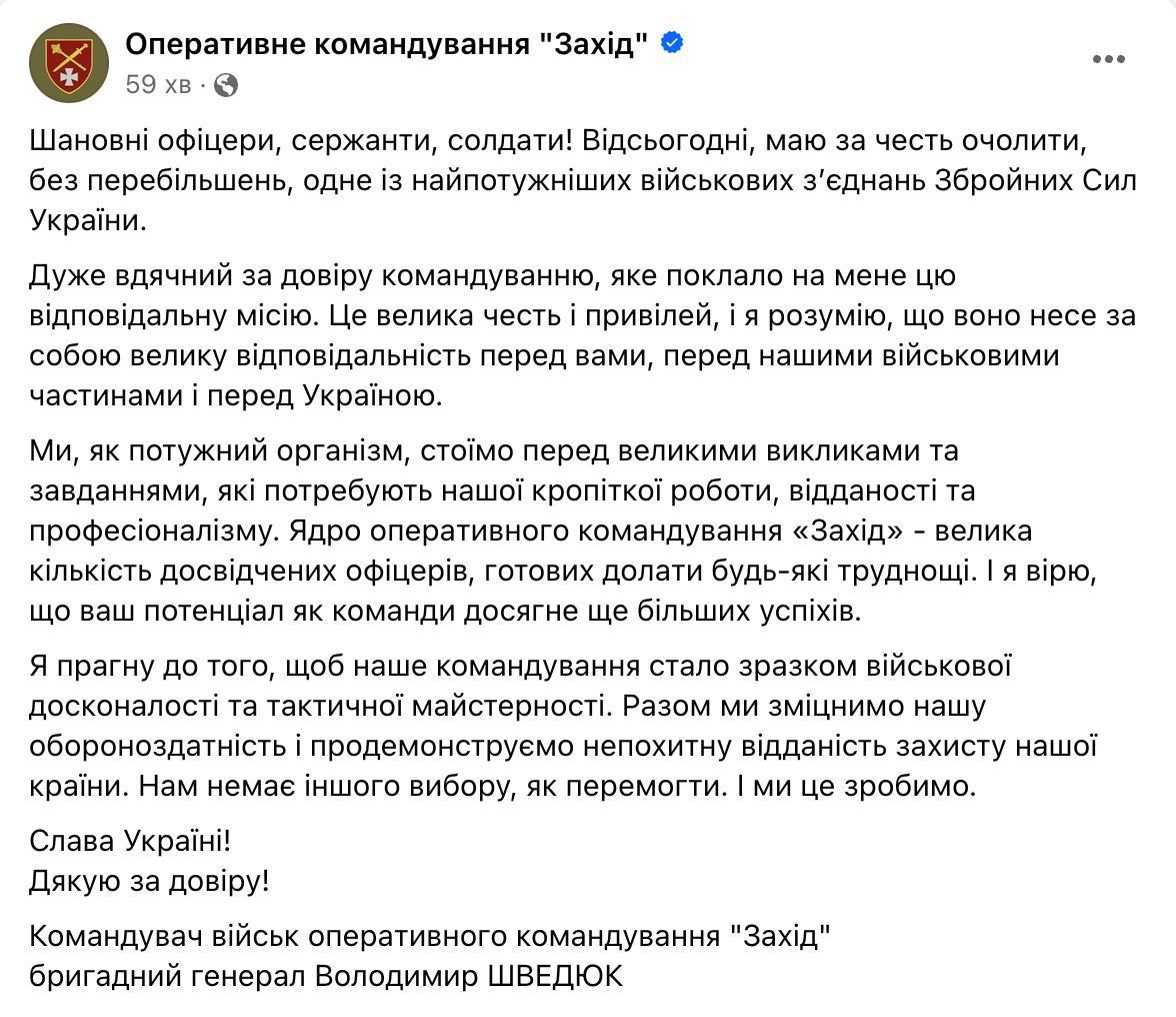 Как заявил сам Владимир Шведюк, с 15 апреля он "имеет честь возглавить одно из мощнейших военных соединений Вооруженных сил Украины".