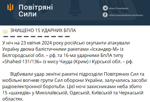 Ночью 23 апреля было сбито 15 "Шахедов" в Николаевской, Одесской, Киевской и Черкасской областях. Всего было запущено 16 беспилотников.
