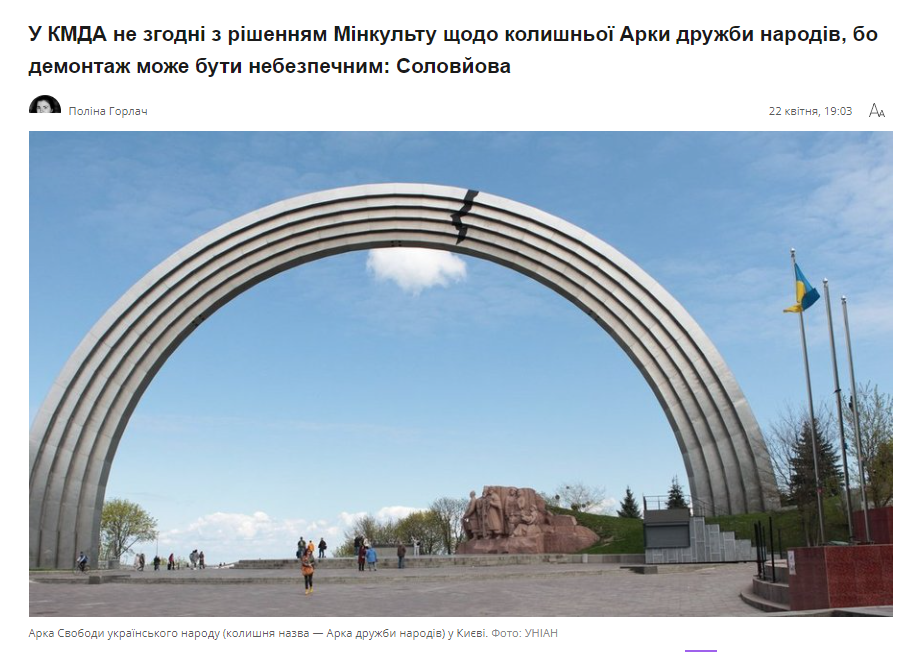 КГГА не хочет сносить бывшую Арку дружбы народов, поскольку она символизирует толерантность украинцев и сдерживает холм, на котором расположена, от смещения.