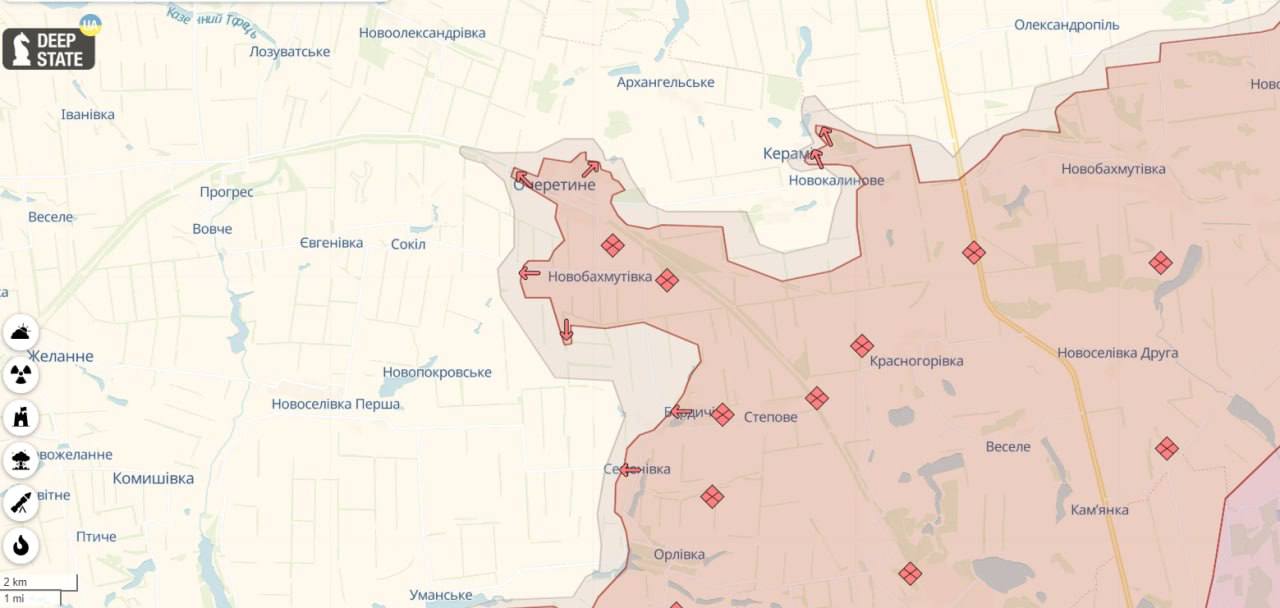 Также, судя по карте, войска РФ продвинулись к востоку от Керамика к северу от Авдеевки и вошли на окраины поселка. При этом российские паблики с утра начали писать о том, что Керамик уже захвачен. Украина этого не подтверждала.