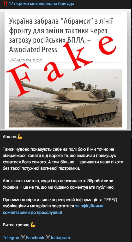 15:31 47-я бригада прокомментировала информацию американских СМИ о том, что ВСУ отвели танки Abrams с передовой из-за угрозы их уничтожения российскими дронами.