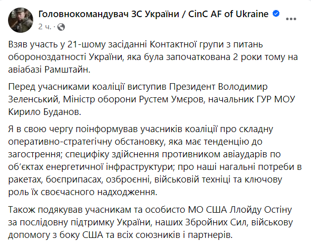 "Я проинформировал участников коалиции о сложной оперативно-стратегической обстановке, имеющей тенденцию к обострению; специфику осуществления противником авиаударов по объектам энергетической инфраструктуры; о наших неотложных потребностях в ракетах, боеприпасах, вооружении, военной технике и ключевой роли их своевременного поступления", - написал он в Facebook о своем выступлении во время 21-го заседания Контактной группы по обороноспособности Украины на авиабазе Рамштайн.