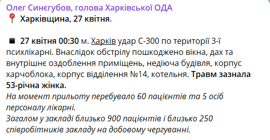 "В результате обстрела повреждены окна, крыша и внутренняя отделка помещений, недействующее здание, корпус пищеблока, корпус отделения №14, котельная. Травму получила 53-летняя женщина", - рассказал губернатор Синегубов.