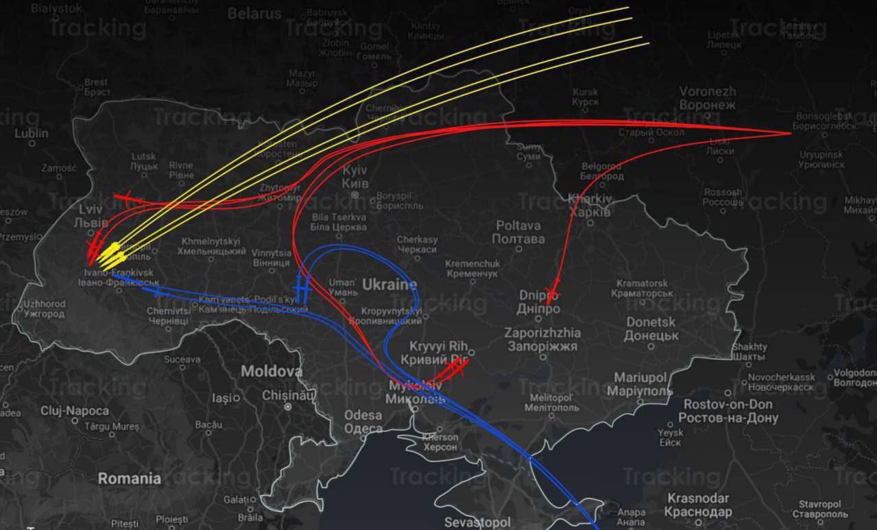 10:29 Маршрут движения крылатых ракет и "Кинжалов", которые сегодня ночью атаковали Украину.
