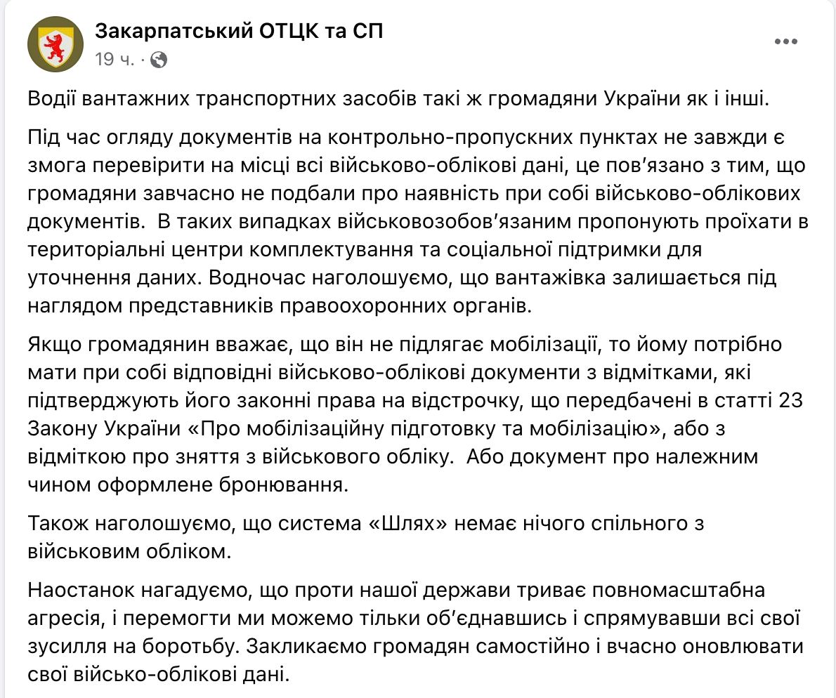 "Водители грузовых транспортных средств такие же граждане Украины, как и другие. При осмотре документов на контрольно-пропускных пунктах не всегда есть возможность проверить на месте все военно-учетные данные, это связано с тем, что граждане заблаговременно не позаботились о наличии при себе военно-учетных документов. В таких случаях военнообязанным предлагают проехать в территориальные центры комплектования и социальной поддержки для уточнения данных", - заявляет ТЦК.