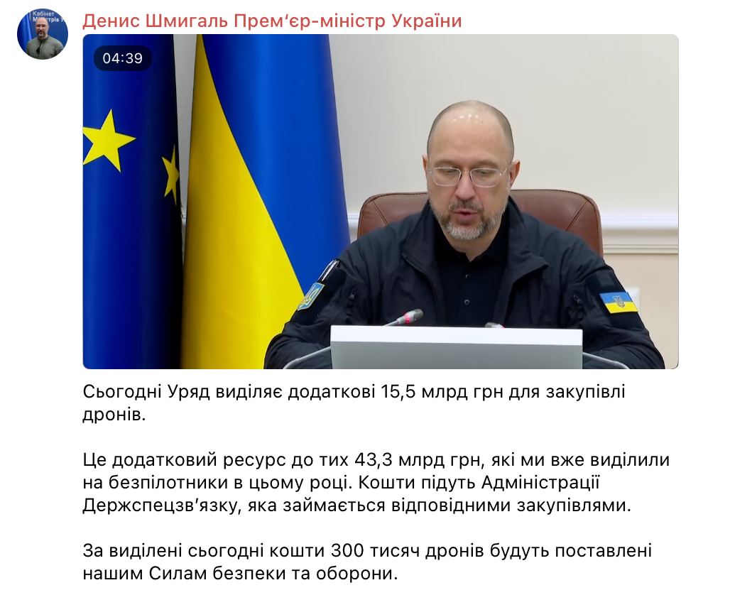 17:48 Кабмин выделил дополнительные 15,5 млрд грн на закупку 300 тысяч дронов для ВСУ, сообщил премьер Денис Шмыгаль.