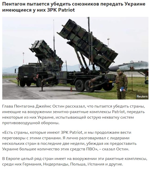 Пентагон пытается убедить союзников передать Украине свои ЗРК Patriot