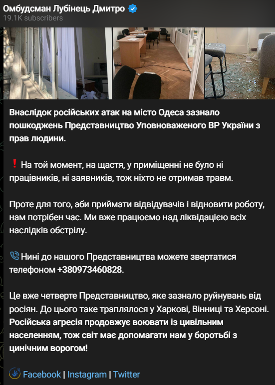 Кроме того, уполномоченный Верховной Рады по правам человека Дмитрий Лубинец сообщил, что вчерашним обстрелом был поврежден офис омбудсмена.