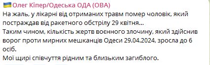 "К сожалению, в больнице от полученных травм скончался мужчина, пострадавший от ракетных обстрелов 29 апреля", - сообщили сегодня в Одесской ОВА.