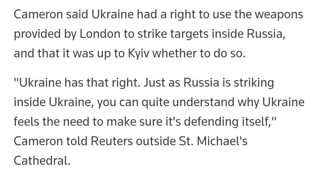 "Кэмерон заявил, что Украина имеет право использовать оружие, предоставленное Лондоном, для нанесения ударов по целям внутри России, и что Киев должен решать, делать ли это", - говорится в сообщении.