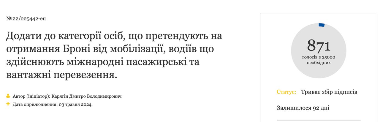 "Добавить в категорию лиц, претендующих на получение брони от мобилизации, водителей, осуществляющих международные пассажирские и грузовые перевозки", - говорится в ней.